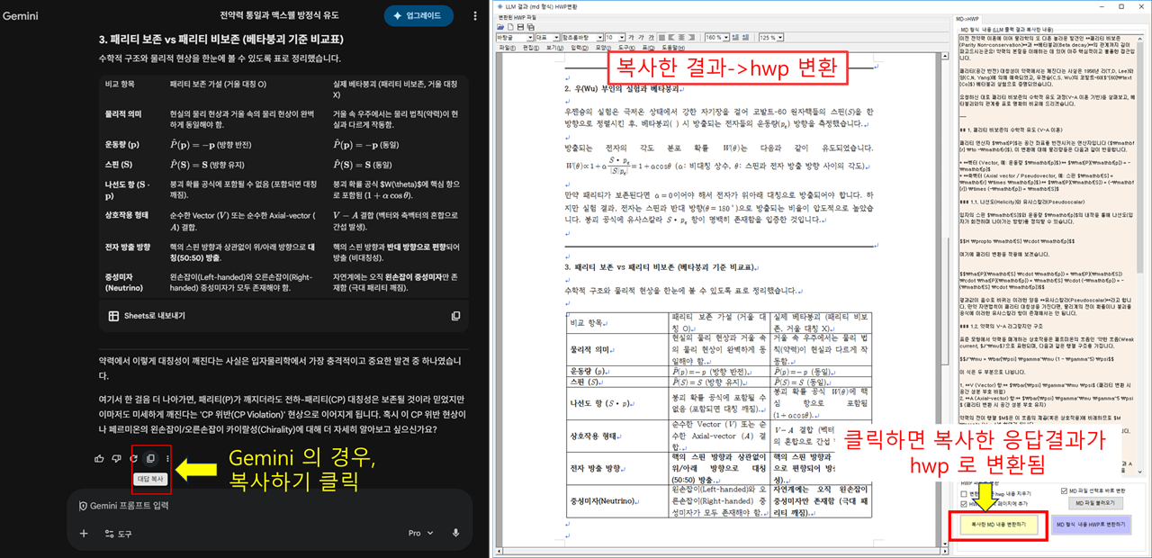 Gemini나 ChatGPT 같은 LLM의 답변을 HWP(한글)에 그대로 복사해서 붙여넣으면, 수식이나 표가 심하게 깨지거나 누락되는 불편함이 있습니다.