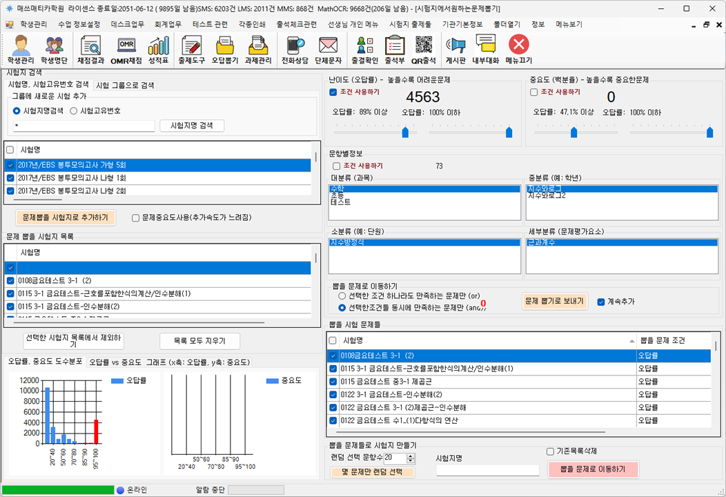- 한글 파일(HWP)이나 PDF 자료를 등록한 후, 문항별 정보를 입력하면, 특정 문항을 여러 시험지에서 추출하여 새로운 자료로 만들어 줍니다.