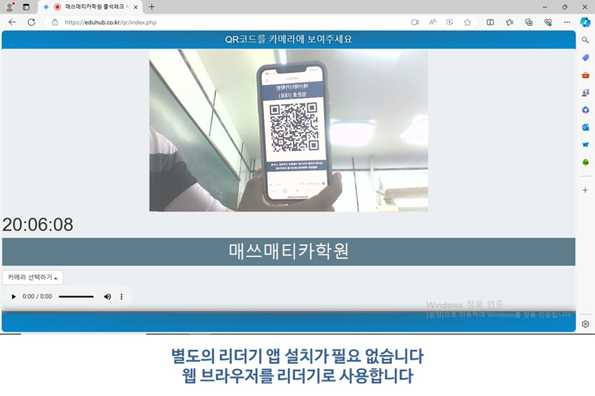 - 웹 브라우저로 QR 코드 리더기 주소에 접속하면 됩니다. ( https://eduhub.co.kr/qr )