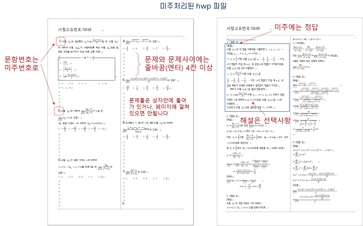 - PDF 파일이 아닌 HWP 파일을 등록하여 오답 문제 추출등을 하려면, 미주처리가 된 HWP 파일을 업로드 해야 합니다.
