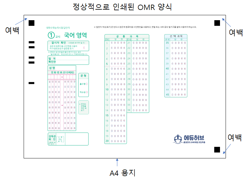 - OMR 양식을 A4 용지에 인쇄 했을 때, 아래 예시와 같이 OMR 양식의 가장자리 정사각형 3개 주변에 여백이 있어야 합니다.