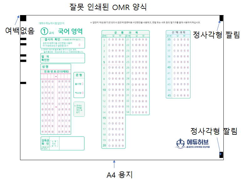OMR 양식을 복사해 사용하는 경우, 이물질이 마커에 인쇄가 되거나, 뒤틀림이 발생할 수 있습니다.