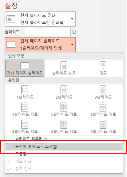 - 인쇄 후 정사각형 주변에 여백이 없으면, 파워포인트 인쇄 시 '용지에 맞게 크기 조정' 옵션을 체크하지 말고 인쇄하시기 바랍니다.
