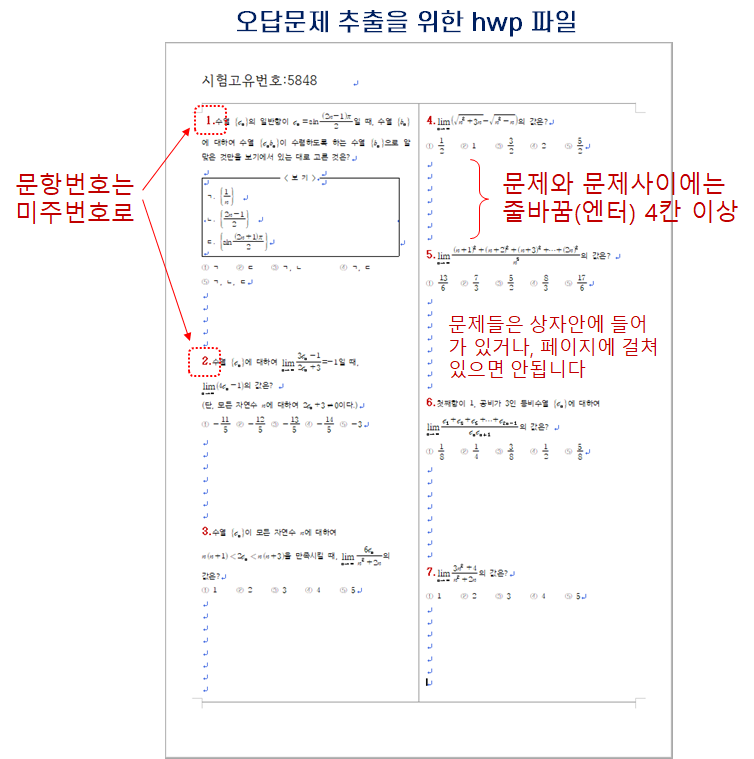 시험지를 hwp 파일로 등록하는 경우, 다음과 같이 미주처리된 문항 간격(줄바꿈, 엔터)이 4칸 이상인 파일을 등록해야 합니다.