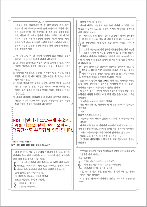 문장별로 자른 PDF 이미지로 오답을 생성하므로,아래와 같이 문장이 다른 단에 걸쳐 있어도 자연스럽게 표시됩니다.