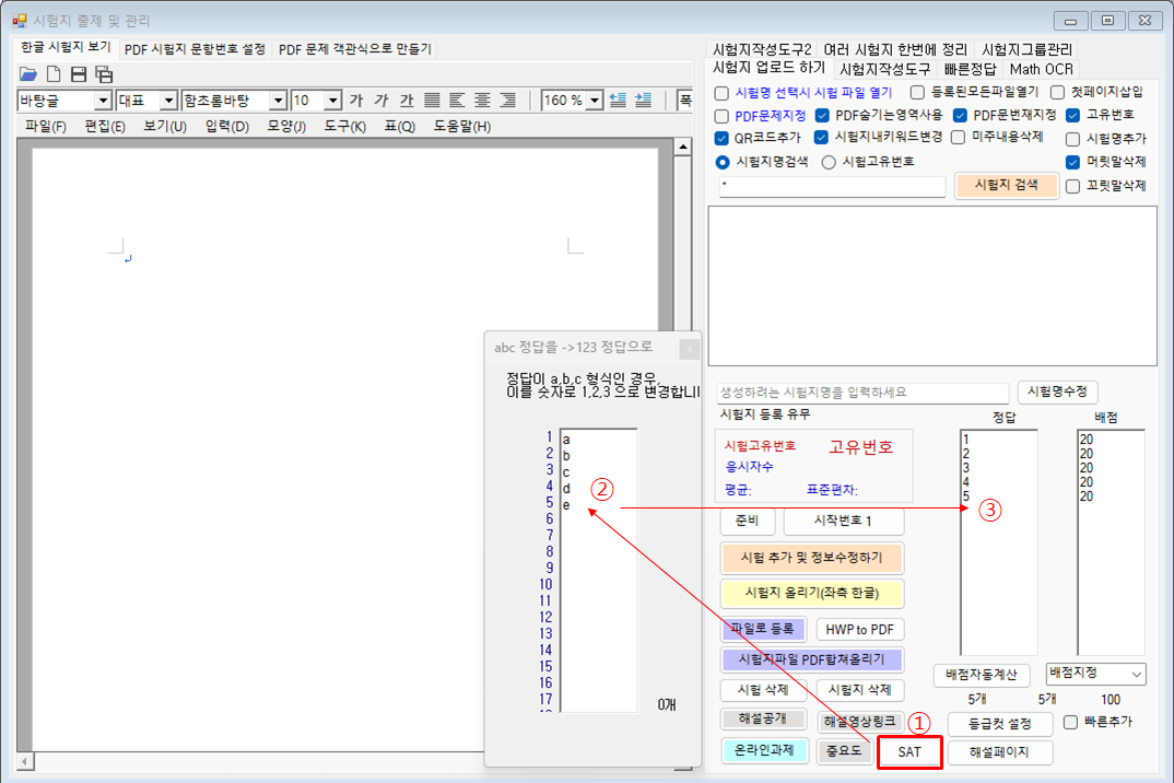 이때, 시험지출제도구의 SAT 버튼①을 클릭하면, A,B,C로 된 정답을 1,2,3 정답으로 바꿔주는 창②이 열립니다.