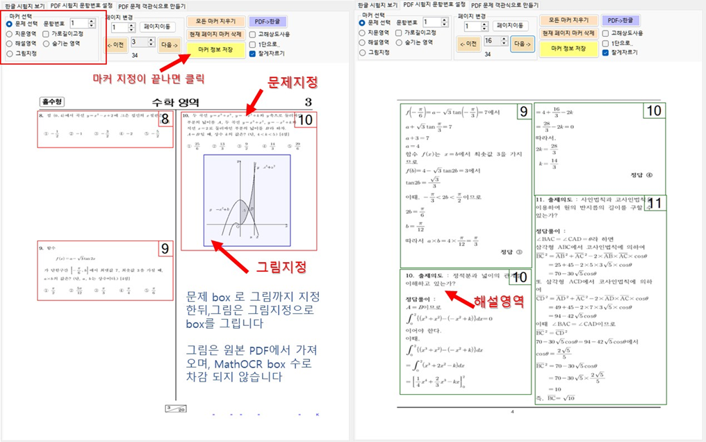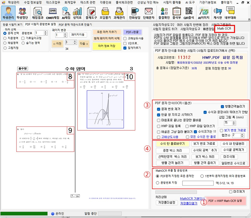 PDF 시험지 문항 번호 설정에 있는 PDF->한글 버튼은 PDF에 문제지정한 부분을 PDF 에서 잘라와 hwp 파일에 붙여 만들어 주는 기능으로 MathOCR 이 아닙니다.