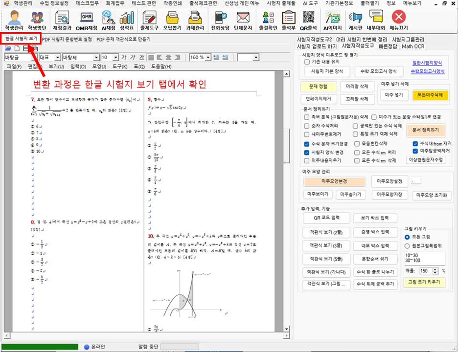 변환 과정은 '한글 시험지 보기' 탭에서 볼 수 있습니다.