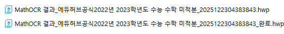 _완료.hwp 로 끝나지 않은 파일은 에듀허브의 한글 시험지 보기 탭에서 열고 있는 파일입니다.