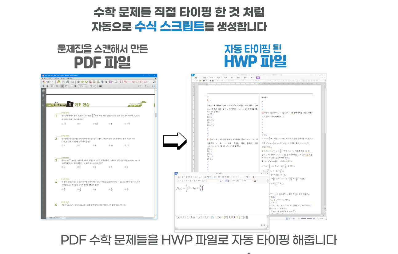 수학 문제의 복잡한 수식도 hwp 수식 스크립트를 사용하여 만들어 줍니다.