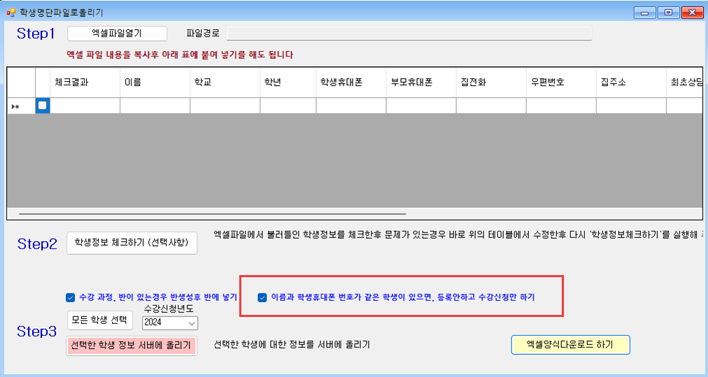 만약, 학생은 미리 등록되어 있는 상태에서, 엑셀 명단으로 학생을 반에 넣으려면, '이름과 학생 휴대폰 번호가 같은 학생이 있으면, 등록 안하고 수강 신청만 하기' 옵션에 체크를 한 뒤, 명단을 올리면 됩니다.