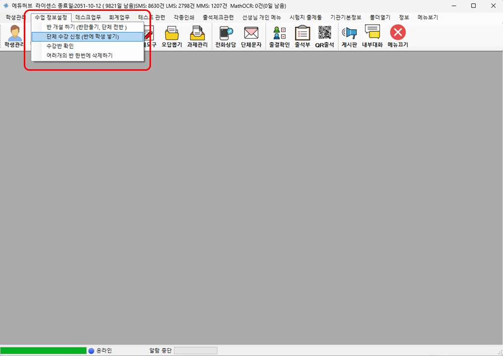 - '수업 정보설정' -> '단체 수강 신청' 메뉴를 실행합니다