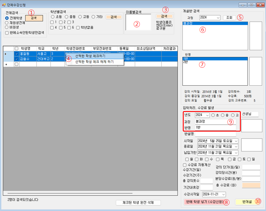 새로운 과정, 반을 생성해야 하는 경우에는 과정, 반명 ⑨ 작성후 반개설 버튼⑩ 을 클릭하여 반을 생성 한 뒤, 위의 4,5 단계를 따르면 됩니다.