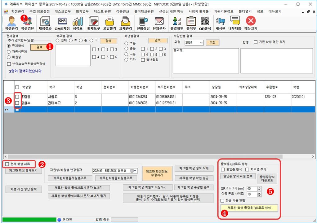 - 검색 버튼❶ 을 클릭해 학생 명단 조회 후, 개인 QR 코드를 만들 학생을 체크❸합니다.