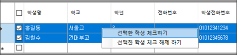 단체 학생 체크 버튼❷ 을 눌러 모든 학생을 체크하거나, 아래 그림 처럼 학생을 마우스로 드래그 한 뒤, 마우스 우클릭 후 선택한 학생을 체크 해도 됩니다