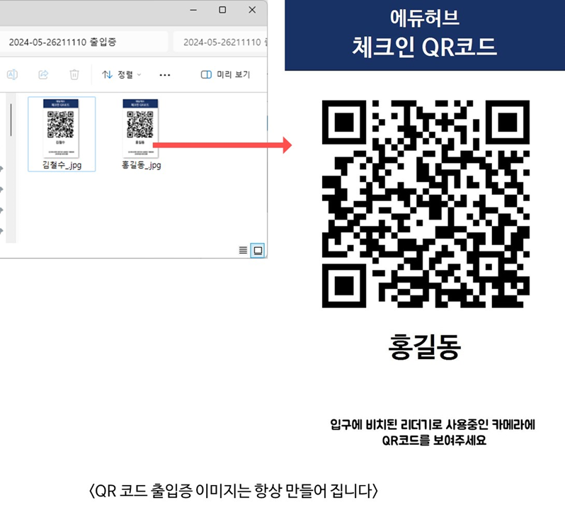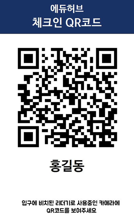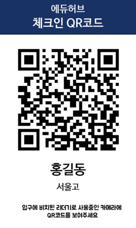 학생들에게 각자 고유한 QR 코드를 발급해 주고, 교육장의 QR 코드 리더기에 자신의 QR 코드를 찍어 출석을 확인하는 방식입니다.
