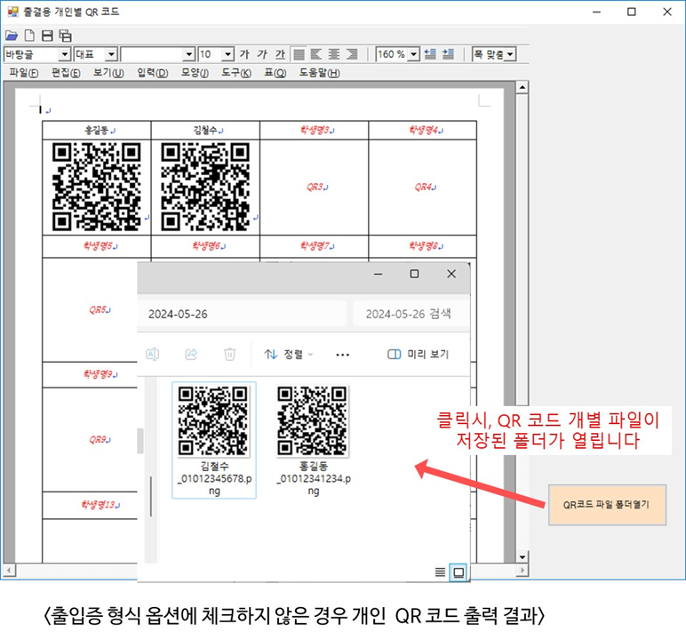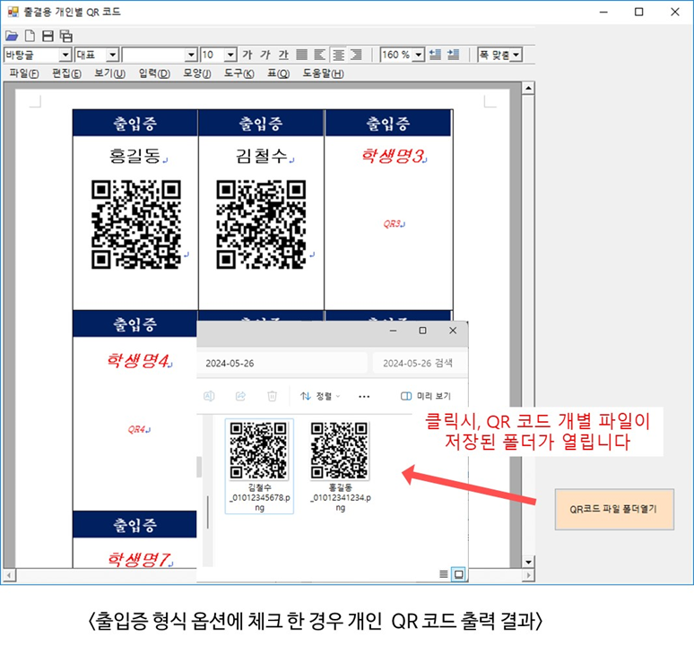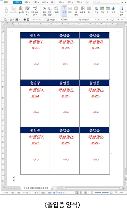 출입증 양식 내 붉은색 글씨는 한글 프로그램에서 사용되는 누름틀이며, 이 누름틀 안에 학생들의 이름과 QR 코드들이 들어가며, 인쇄시 붉은색 글씨는 인쇄가 되지 않습니다.