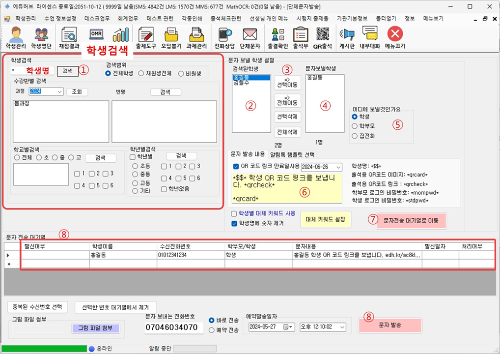 - 학생의 어떤 전화번호로 문자를 보낼지를 선택 ⑤ 합니다.