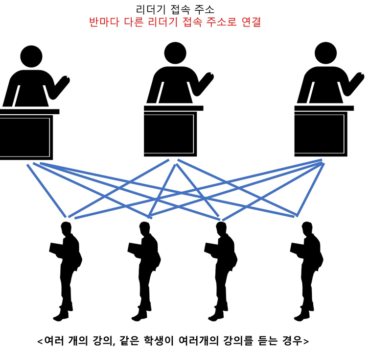 한 명의 학생이 여러개의 강의를 듣는 경우, 강의마다 다른 리더기 접속 주소를 사용해야 합니다.