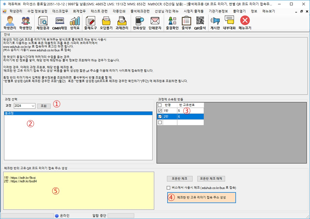 - 체크한 반 고유 리더기 접속 주소 생성 버튼 ④을 클릭하면,