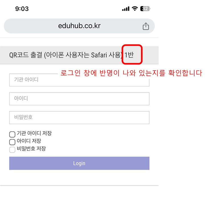 리더기로 사용할 장치에, 해당 반에 생성된 반 고유 리더기 접속 주소로 접속합니다. - 고유 리더기 로그인 창에 반명이 나오는지를 확인합니다.