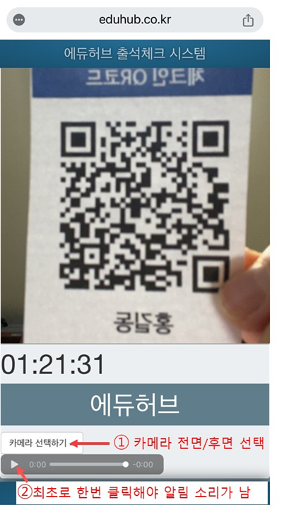 재생 버튼 ② 를 최초로 한번 클릭합니다. 그러면, 학생들이 QR 코드를 체크 한 경우 '삑' 하는 소리가 나게 됩니다.