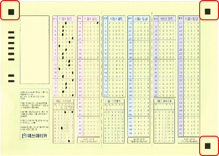 - 스캔한 jpg 파일은 아래 그림과 같이 OMR 가장자리의 3개의 정사각형이 정확히 스캔되어야 합니다.