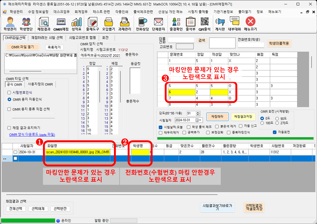 OMR 답안에 마킹하지 않은 문제가 있는 경우, 채점 결과의 파일명이 노란색으로 표시됩니다.