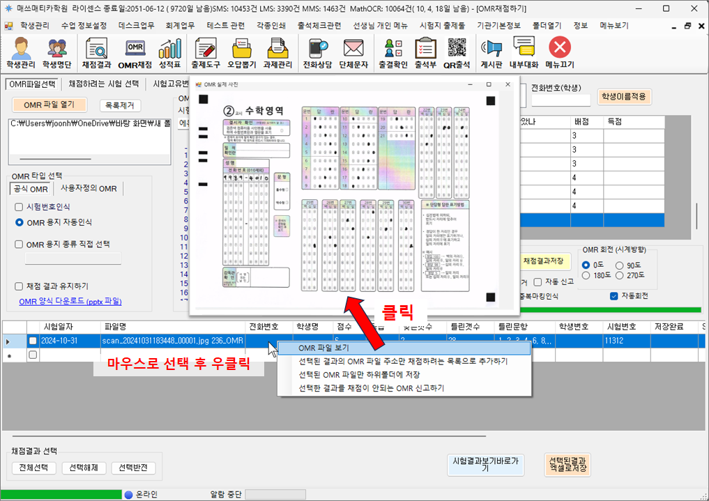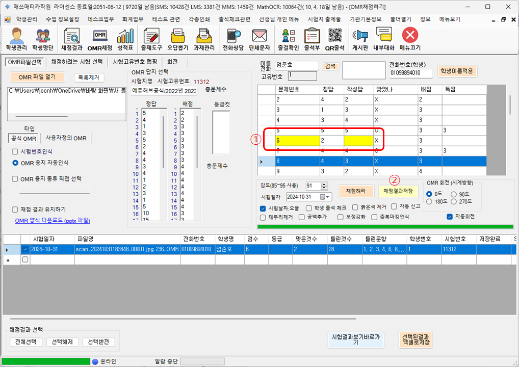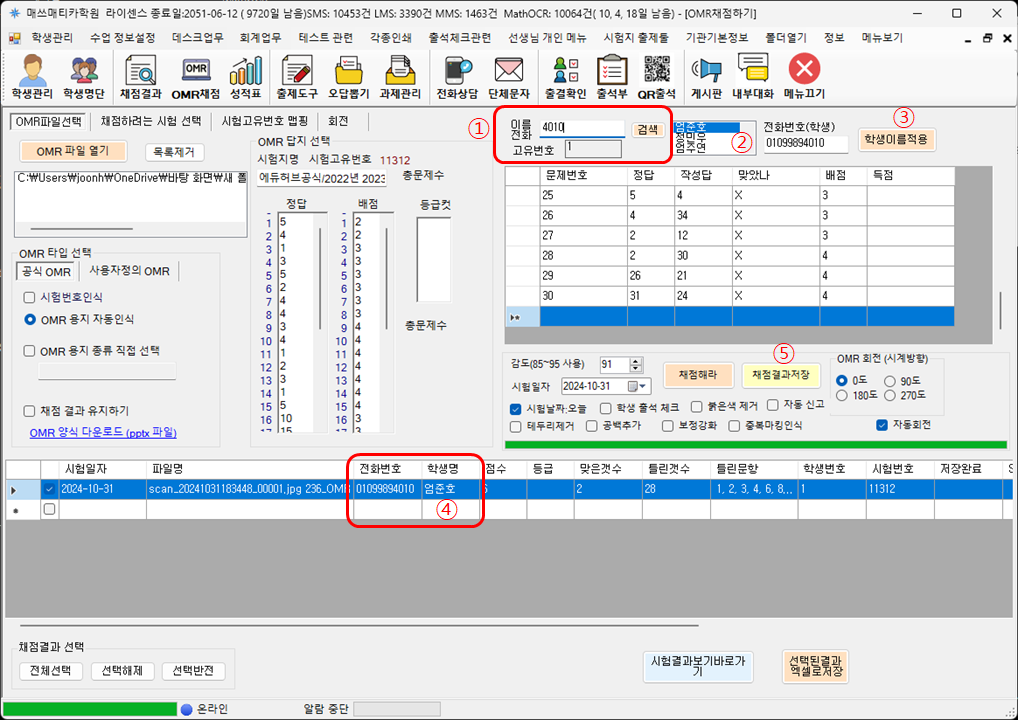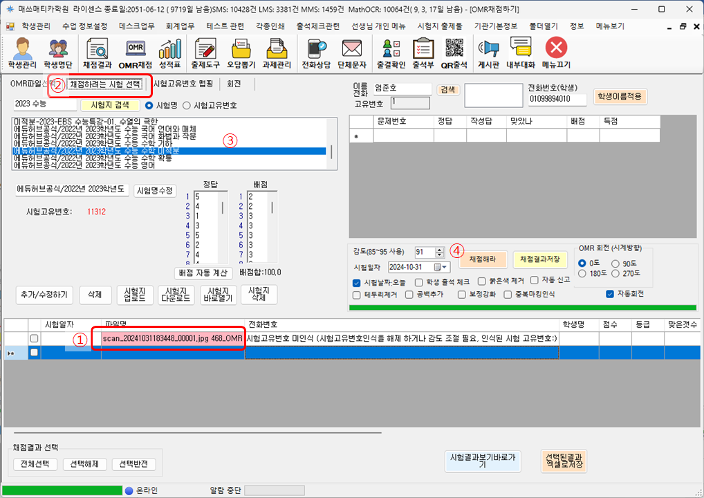 - 스캔한 OMR 파일에서 학생의 수험번호(전화번호)를 확인합니다