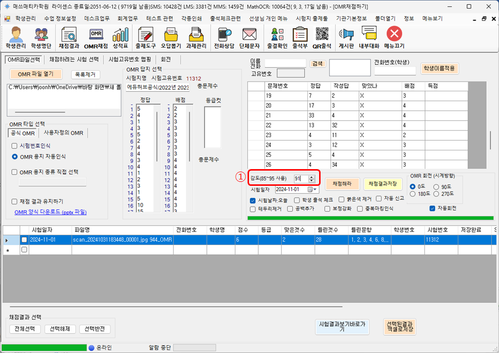 OMR 마킹을 연필로 흐리게 한 경우, 채점시 감도를 올려야 합니다.