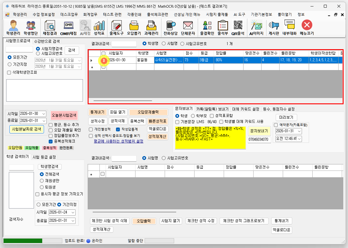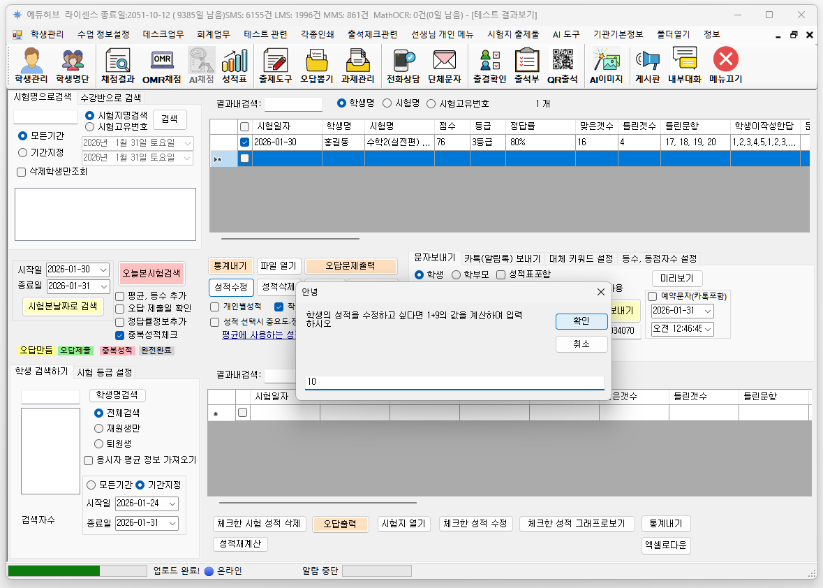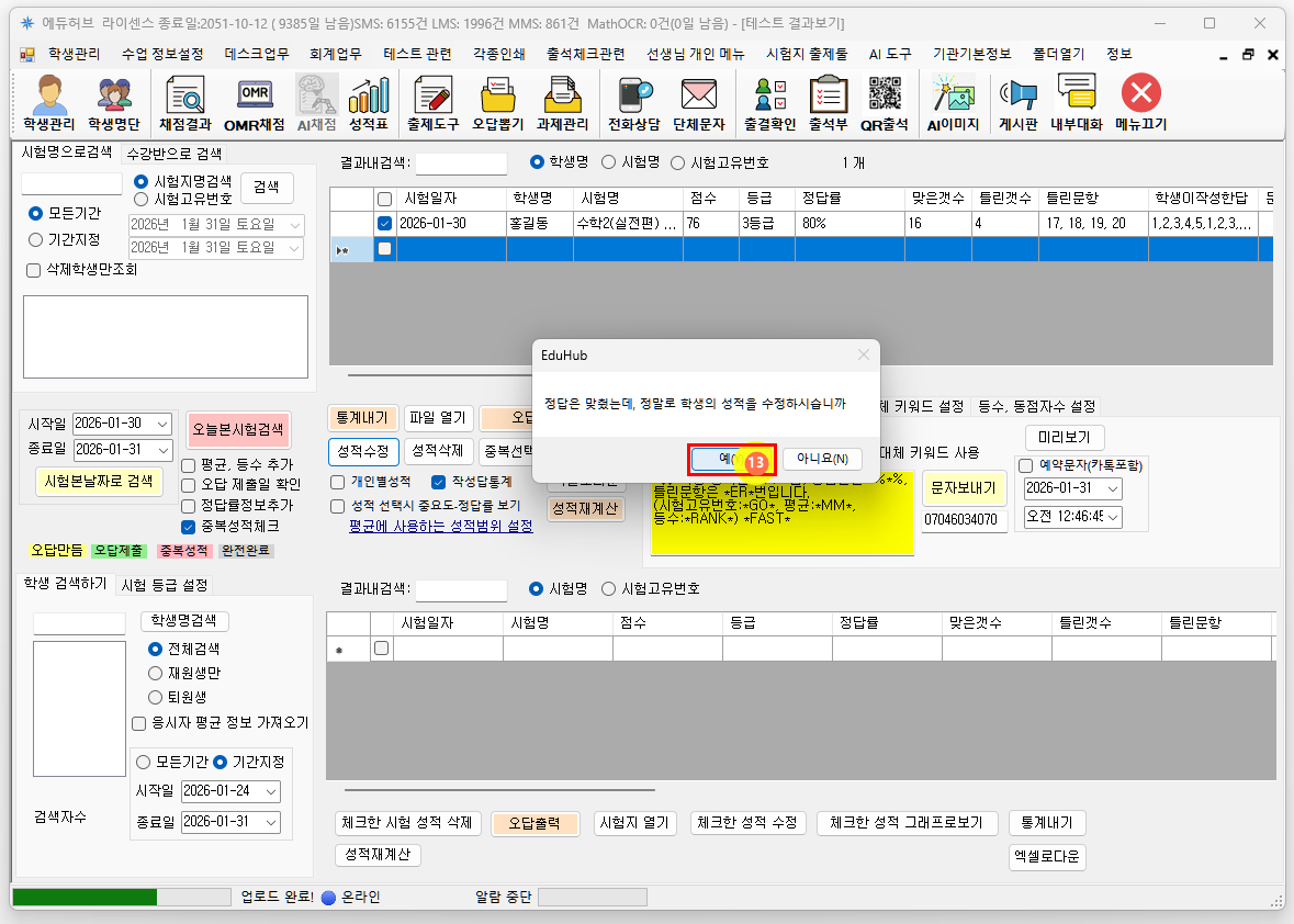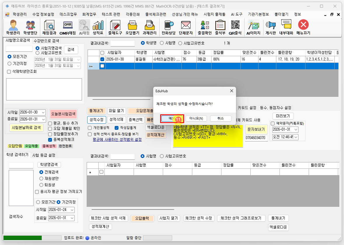 예를 클릭하여 체크된 학생의 성적을 수정합니다.