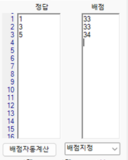 - 배점 자동 계산 버튼 ⑤을 클릭하면, 정답 합이 100이 되도록 자동으로 배점을 입력합니다.