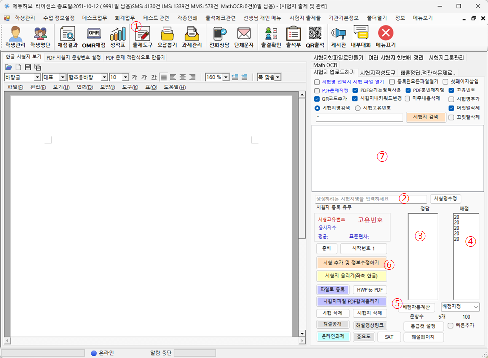 이 기능은 사진으로 찍은 문제등을 한글창⑤에 붙여넣고, 시험지 올리기(좌측 한글) 버튼 ④을 눌로 한글 파일을 등록하고, 이를 PDF 로 변환하는데 유용하게 사용됩니다.