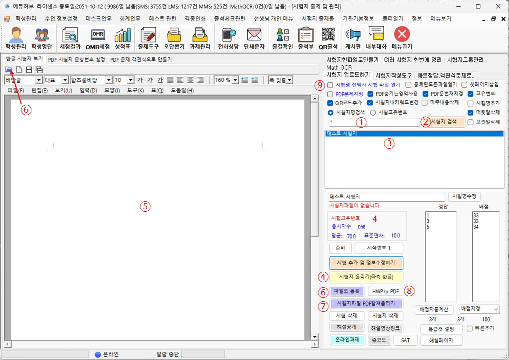 등록 가능한 시험지 파일을 hwp, pdf 파일 두 종류만 가능합니다. - '시험명 선택시 시험 파일 열기' 옵션 ⑨을 체크 한뒤, 시험명을 클릭 ③ 하면, 등록된 시험지가 열리게 됩니다.