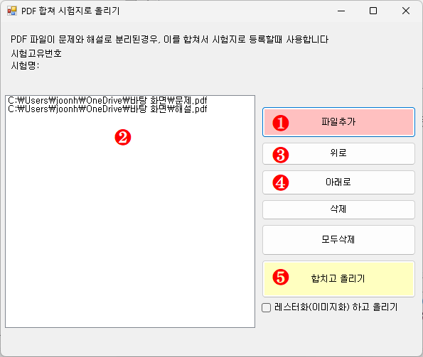 - 'PDF 합쳐 시험지로 올리기' 창의 파일추가 버튼❶을 클릭 하여, 문제와 해설 파일을 선택하면, 파일 목록 창 ❷창에 추가 됩니다.