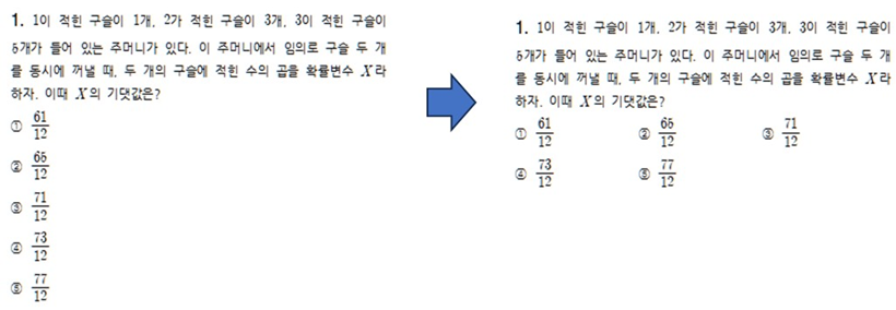 보기 번호를 일렬로 나열하지 않고, 가로로 만듭니다. 이 옵션은 가급적 변환시에 사용하지 말고, 변환이 끝난 뒤 상황에 따라 '보기 번호 가로로' 버튼을 클릭하여 사용하는게 좋습니다. |