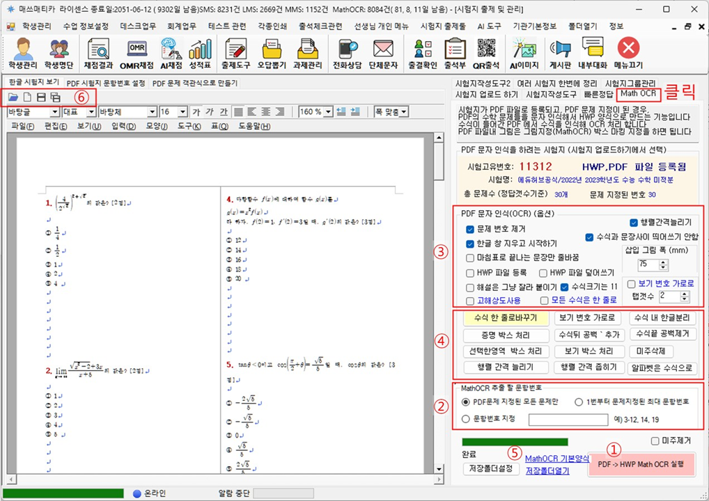 '시험지출제툴' -> '시험지출제관리도구' 실행 후 MathOCR 탭을 클릭합니다