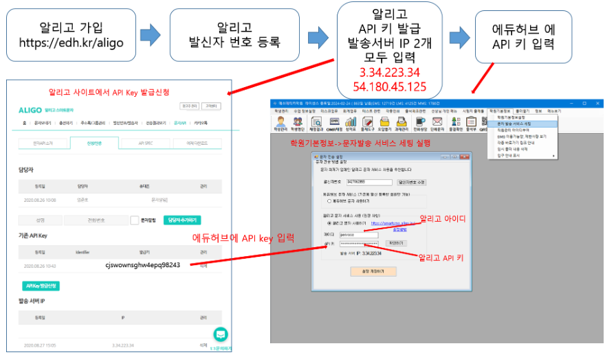 먼저 알리고 서비스에 가입후, 알리고의 API 키를 에듀허브에 입력하는 작업을 해야 합니다 (1회).