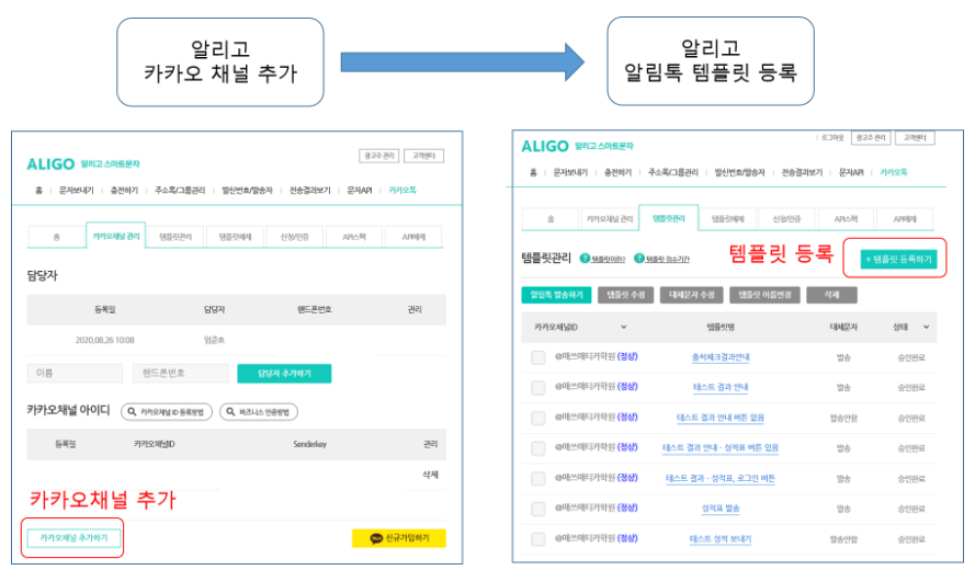 알리고 사이트의 카카오톡->카카오채널관리 메뉴에서 카카오 채널을 등록합니다.