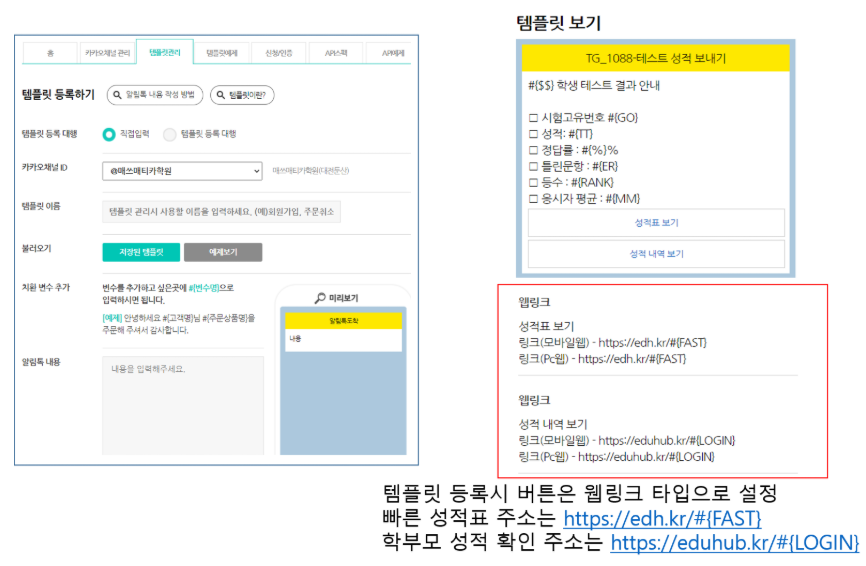 에듀허브에서 카톡 발송시, 에듀허브 내에서 템플릿을 선택후 보내면 됩니다.