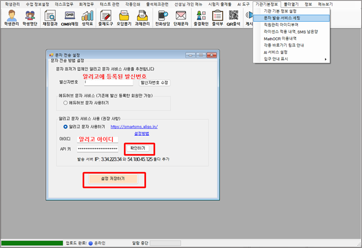 에듀허브 문자 발송을 위한 알리고 설정 방법